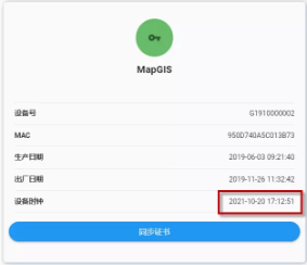 答:硬Key设备里面包含电池,若供电异常,可能导致无法正常连接硬Key设备。可登录MapGIS证书管理器主页面(http://IP:端口号),查看设备信息,若设备时钟与当前时间不一致,则是供电异常问题。请联系销售人员,更换硬Key USB设备。