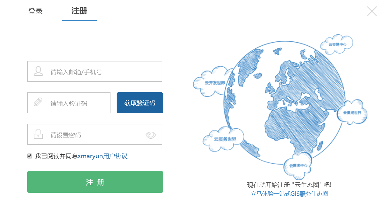 1. 注册开发者账户。在云开发世界(http://www.smaryun.com/dev/)中,用邮箱或手机号注册一个账户,并登录。