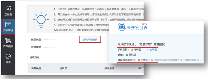 3. 在【工作台】-【开发环境】中,点击【获取开发授权】,需先完成所有认证信息,才能”免费获取”开发授权。