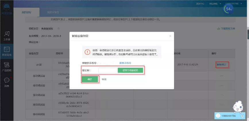 1. 进入“Smaryun开发世界”,在“工作台”->“开发环境”->“我的授权”页面中,点击“解除绑定”->“获取手机验证码”,输入短信验证码,点击"确定",即可完成开发授权的解绑;