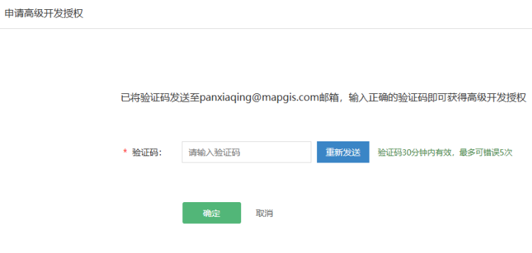 2. 在授权信息界面,点击【立即申请】,填写“验证码”,点击“确定”后,即刻具有高级开发授权权限。