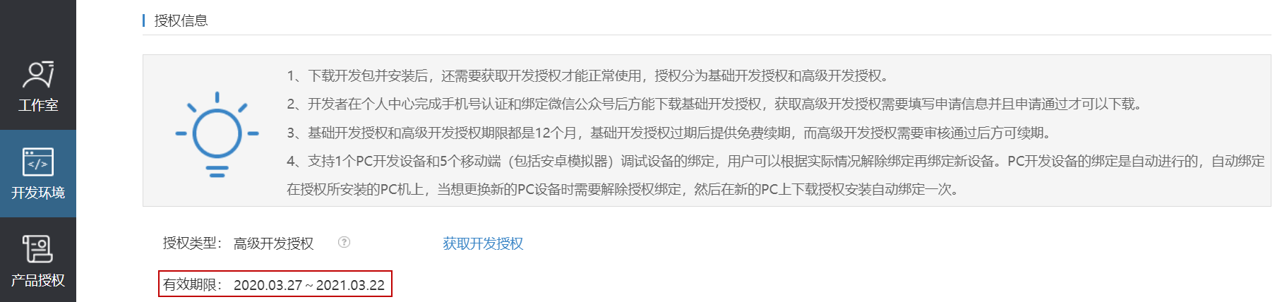 1. 获取基础开发授权且加入某一个工作室后,在【工作台】->【开发环境】->【我的授权】中,点击【获取开发授权】: