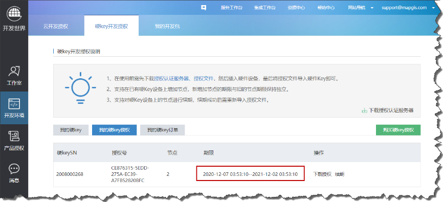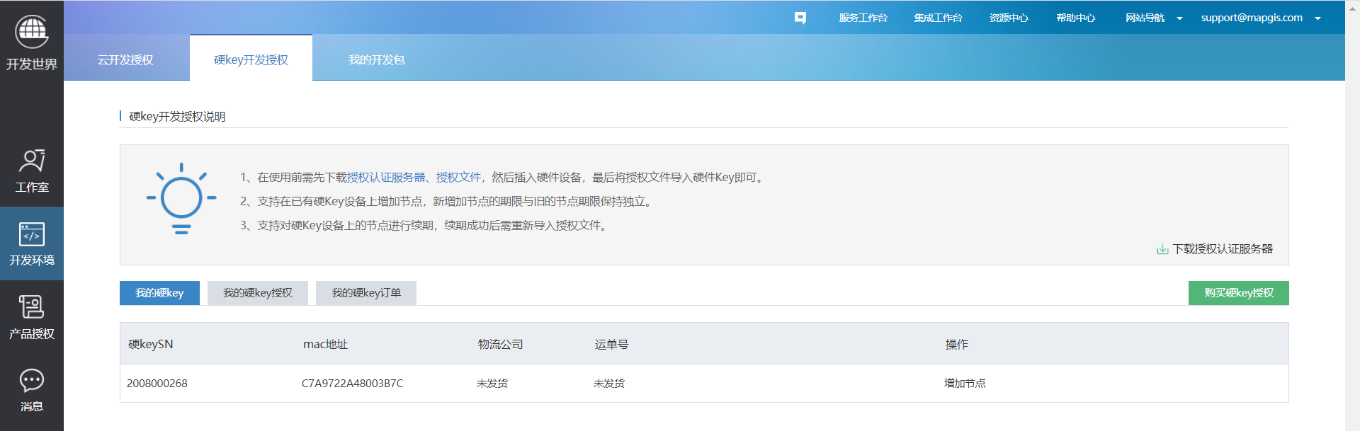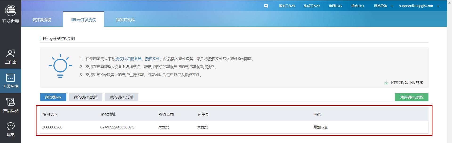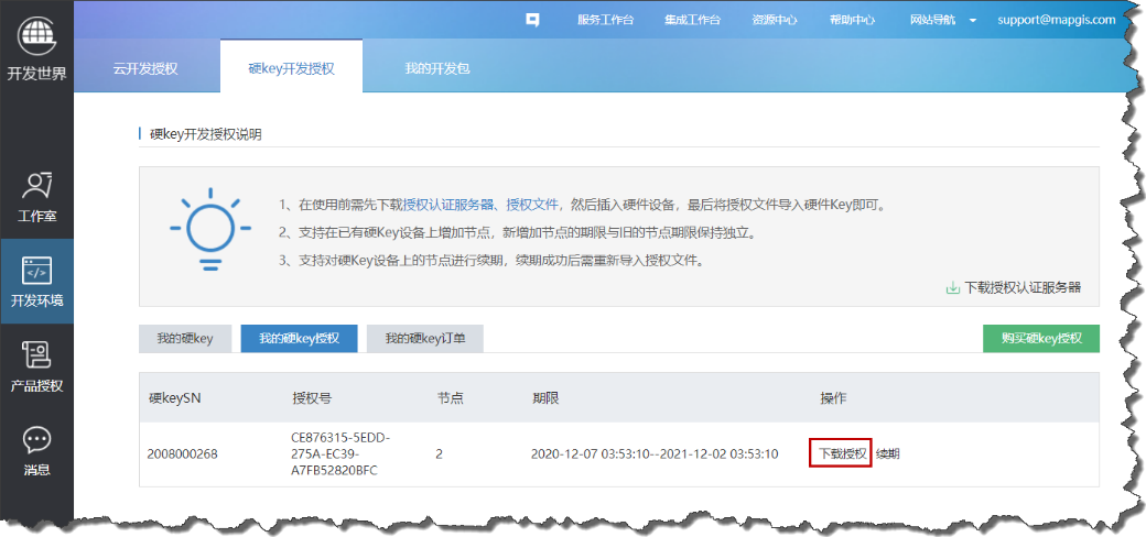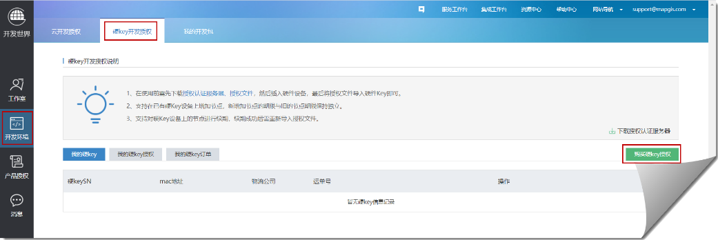 5. 购买成功后,可在“工作台”-“开发环境”中查看到硬Key开发授权信息: