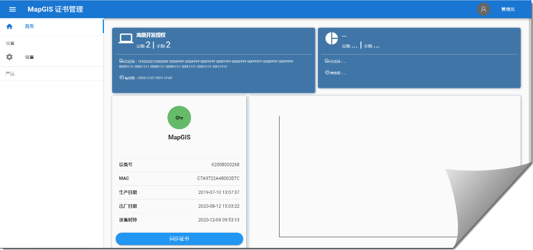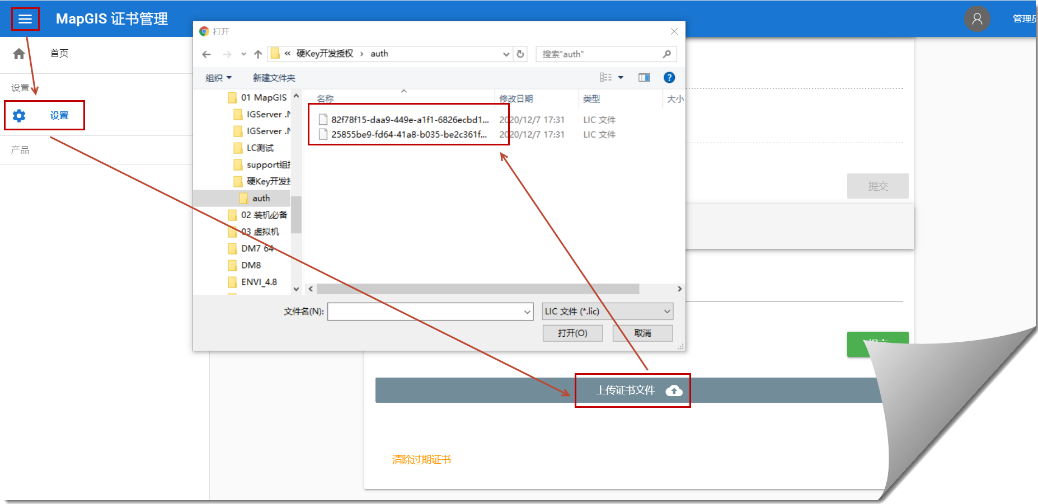 4. 点击MapGIS证书管理左侧按钮,点击设置按钮,进入设置主界面,点击“上传证书文件按钮”,弹出窗口,选择解压后的硬Key开发授权文件,即可加载产品授权信息。