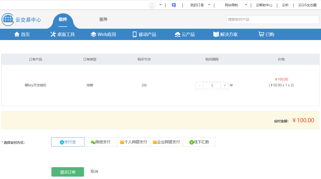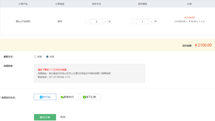 4. 可进入订单详情界面,可选择购买节点数。一个开发授权节点50元,首次购买硬Key开发授权时,还需支付2000元设备费用。