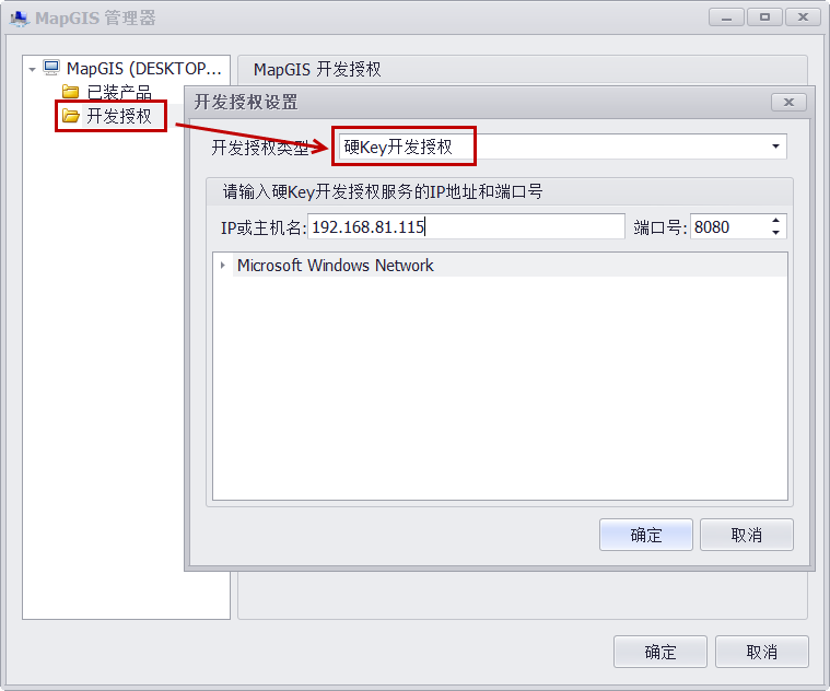 4. 在“开发授权”中选择“硬Key开发授权”,设置 硬Key开发授权的服务器IP地址及端口号。