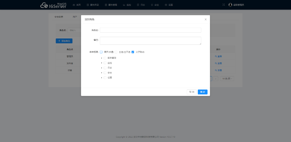 IGServer可通过角色管理来赋予不同的角色权限,为不同类型的用户提供特定的操作权限,保证GIS服务安全。系统提供了管理员、发布者和访客三种内置角色,内置角色只可查看,不可编辑。用户可根据需求自定义角色。