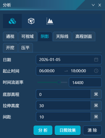- 【日期】:设置分析日期,默认为当前日期。不同日期时,太阳高度角不同,会导致日照结果不同;