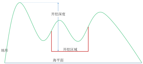 - 【开挖深度】:设置开挖深度。当存在地形数据时,开挖深度是三维数据的最大高度向下计算的深度;当不存在地形数据时,认为地形高度为0,开挖深度是基于0再向下开挖的深度。