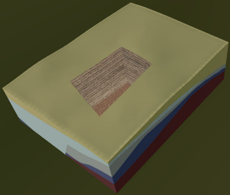 通过开挖参数和交互绘制的多边形,模拟三维数据在多边形区域向下开挖一定深度后的效果。