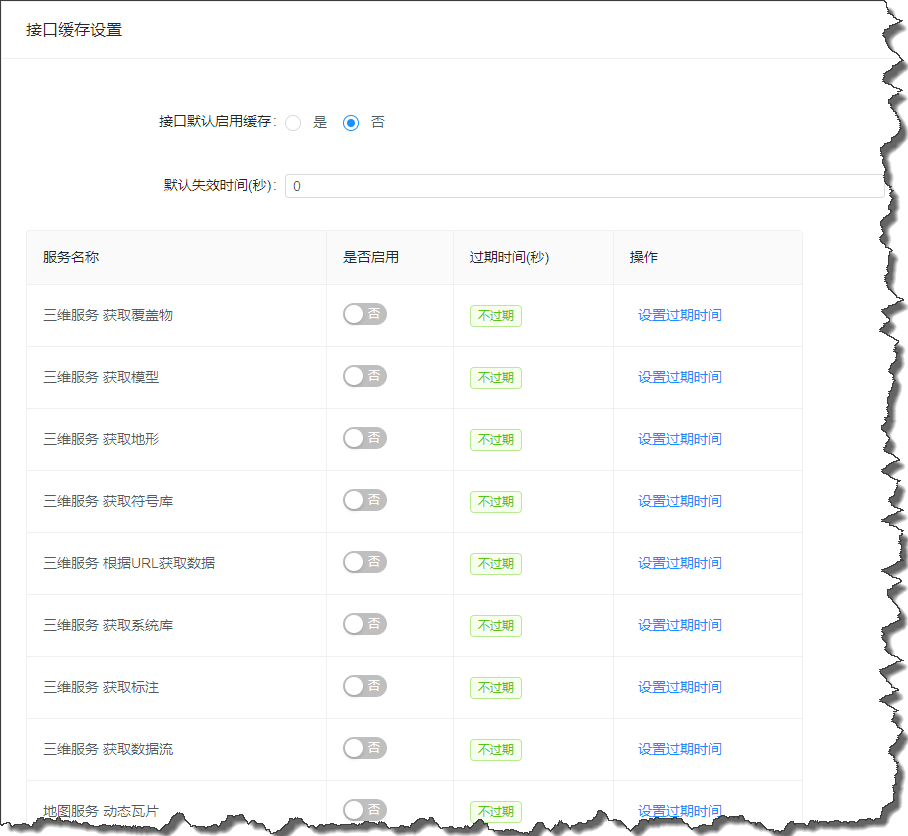 2. 在列表中可单独为每一类接口设置是否启用缓存,缓存过期时间。点击【保存】即可保存信息。