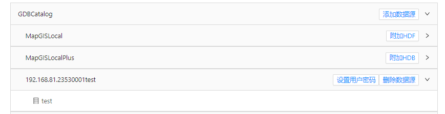MapGIS GDBCatalog目录下已默认列出了本地数据源MapGISLocal、MapGISLocalPlus,可进行HDF/HDB本地数据库的附加。