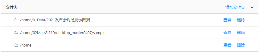 本功能为用户提供了共享文件夹管理功能,可添加/移除文件夹,支持从访问的客户端本地上传文件/文件夹到节点服务器发布服务。用户在发布服务时,可以选择本地文件夹中的文件,如*.mapx、*.mut等。