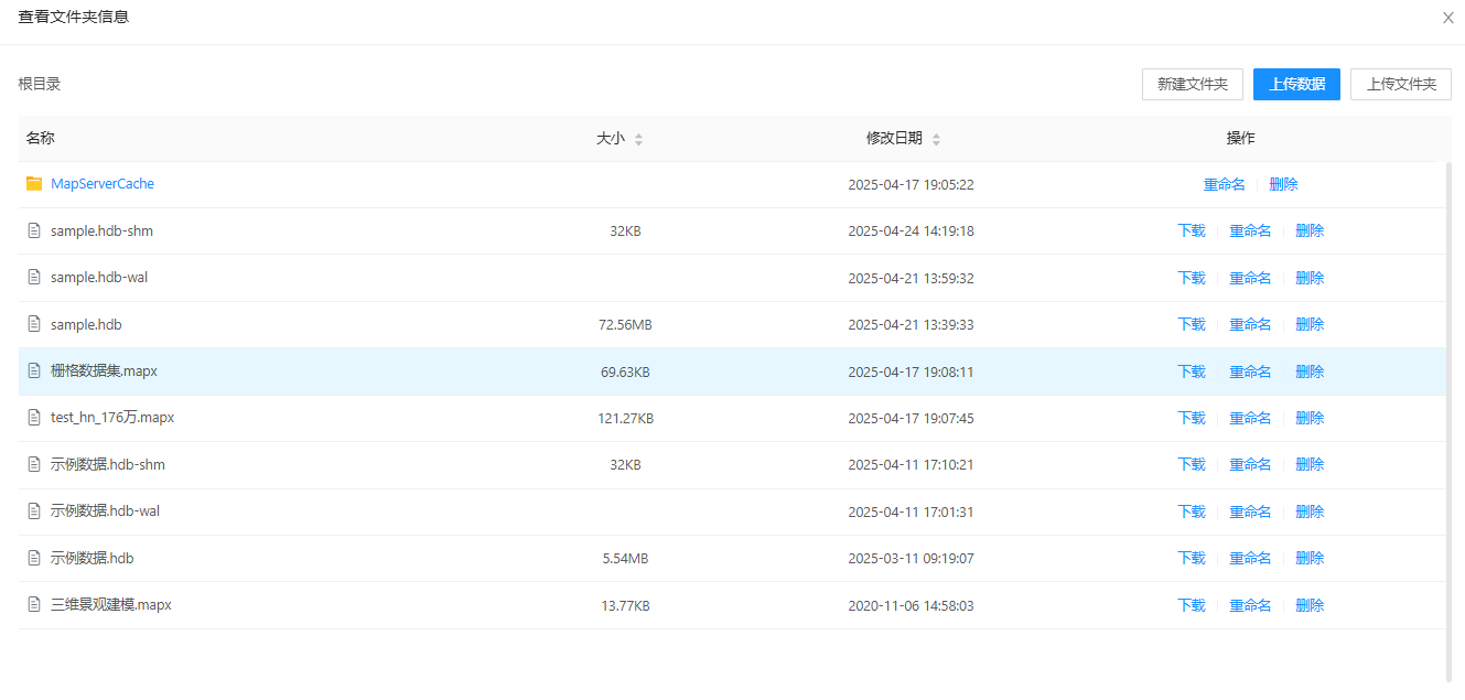 3.点击某个文件夹后的【查看】,看弹出对话框,可查看文件夹所有文件信息,并且在文件夹环境内支持新建、删除、上传、下载、重命名等操作,其中上传数据及上传文件夹可以直接从访问的客户端本地迁移数据到节点服务器文件夹内发布服务,如*.mapx、*.mut等。