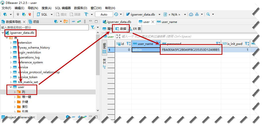 1. 用数据库连接工具(可支持SQLite),打开"MapGIS安装目录\Program\MapGIS.Server.IGServer\igserver_data.db"文件;