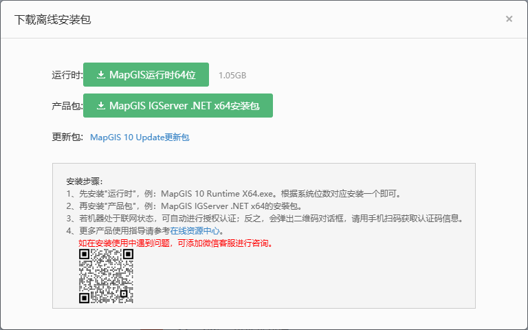 MapGIS IGServer .Net产品更新后,会在“云交易中心”上传新版本安装包。用户只能在“云交易中心”-“已购”中下载最新运行时及产品包,依次更新安装运行时及产品包。