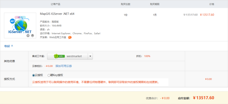 对于无法插入USB设备的涉密单位,可购买单份/多份云授权MapGIS IGServer;