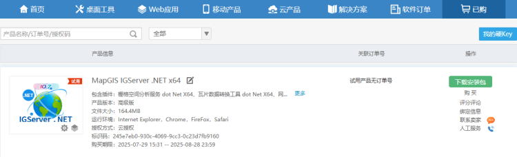 - 在“云交易中心”-“已购”界面中查看到已购买/试用的产品,点击“下载安装包”,下载MapGIS运行时和产品包。