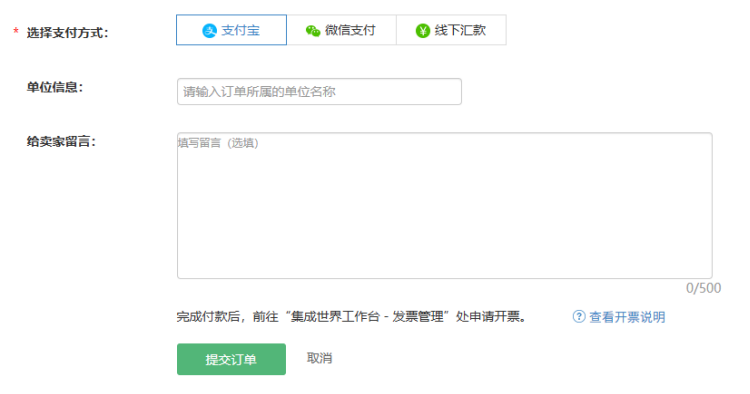 - 选择支付方式,点击【提交订单】,可通过“支付宝”、“微信”、“线下支付”等方式完成订单支付。