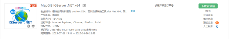 - 在“云交易中心”选择相应的产品,点击【购买】或【试用】,例如购买MapGIS IGServer .Net x64;