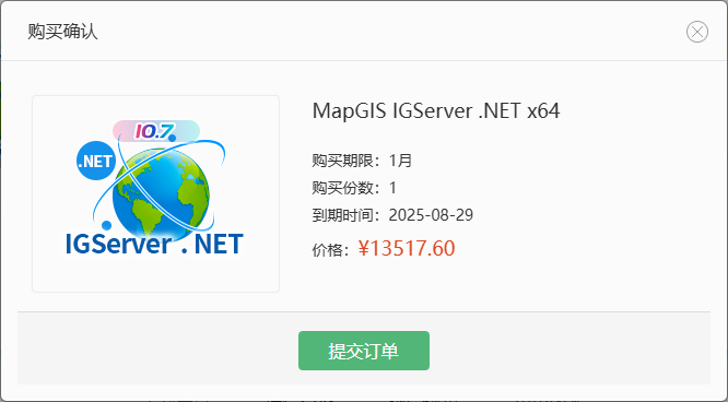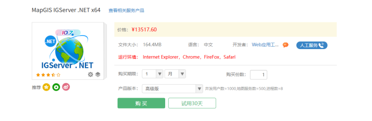 - 在云交易中心选择相应的产品,点击【购买】或【试用】,例如购买MapGIS IGServer .NET x64;
