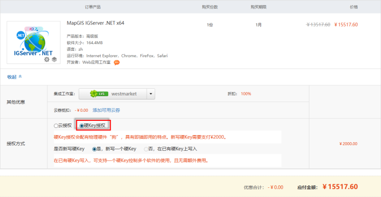 - 进入“确认订单”页面,查看订单信息,选择“硬Key授权”模式;
