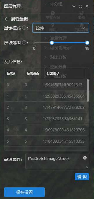 - 【高级属性】:可通过高级属性来设置服务的显示效果,如显示模式采用"拉伸",可设置为"{"isStretchImage":true}"。