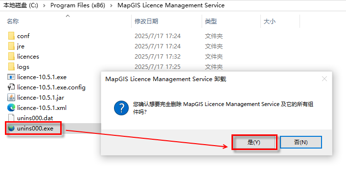 - 进入授权认证服务器安装目录,执行unins000.exe可完成卸载,如图所示: