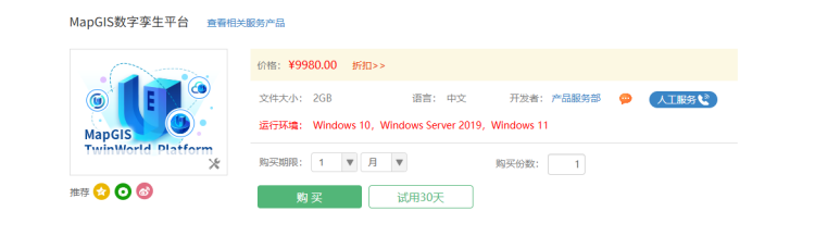 - 在“云交易中心”选择MapGIS数字孪生平台产品,点击“购买”或“试用”;