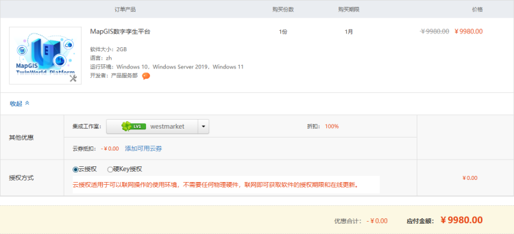 对于无法插入USB设备的涉密单位,可购买单份/多份云授权MapGIS数字孪生平台;