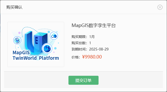 - 在“云交易中心”选择MapGIS数字孪生平台产品,点击“购买”;