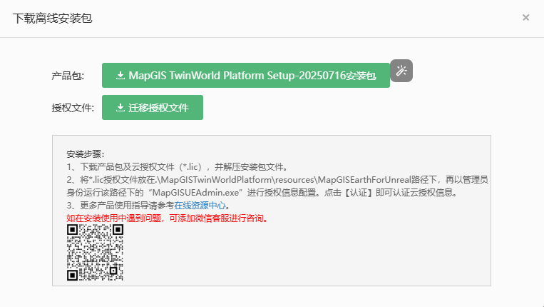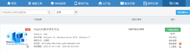 - 点击"下载安装包",即可获取MapGIS数字孪生平台产品安装包和“*.lic”授权文件。
